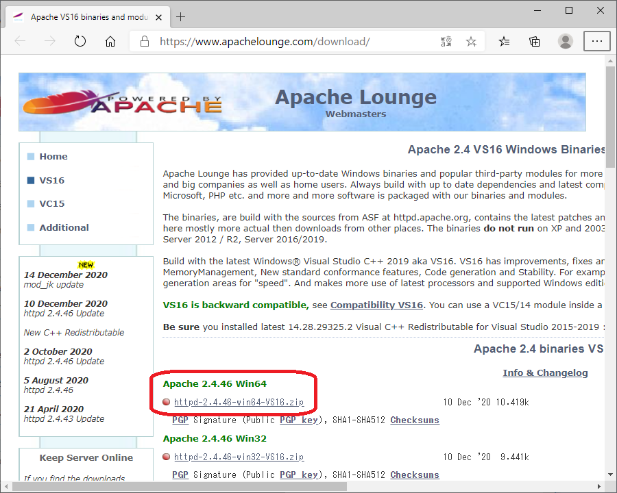 2.Apache 2.4.46 Win64 (httpd-2.4.46-win64-VS16.zip)をダウンロードします。