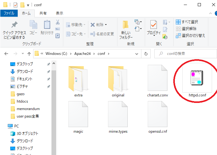 5.C:\Apache24\conf\httpd.confをエディタで開き編集します。