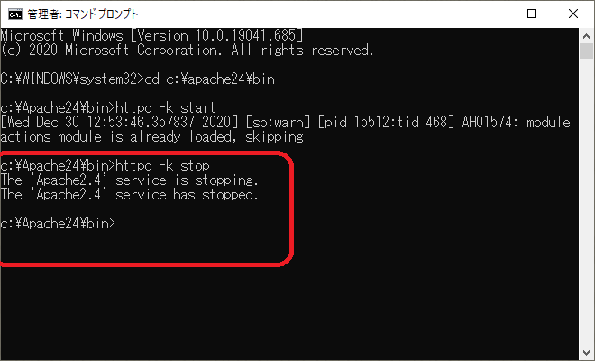 3.「httpd -k stop」を入力してEnter。
